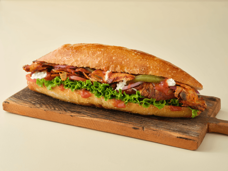 (Tavuk bonfile eti, acılı sos, patates kızartması, turşu, domates, yeşillik, soğan ile)